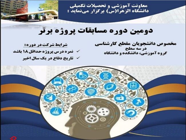تهران- ایرنا- معاونت آموزشی و تحصیلات تکمیلی دانشگاه الزهرا (س) دومین دوره مسابقات پروژه برتر ویژه دانشجویان کارشناسی را برگزار میکند.